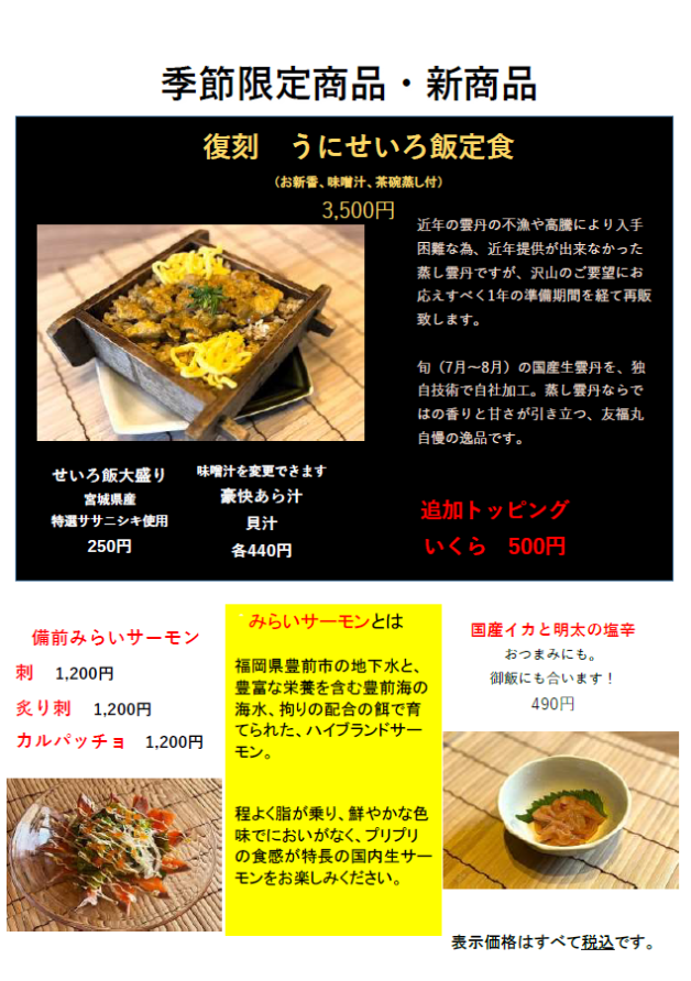 名物の「生うにぶっかけめし」をはじめ、新鮮な海鮮料理を楽しめる友福丸は、地元はもとより、石巻観光で訪れるお客様にも愛されるお店として親しまれてきましたが、平成23年の3.11の大震災により、流出し、平成30年2月まで郊外の仮店舗で営業を続けて参りました。